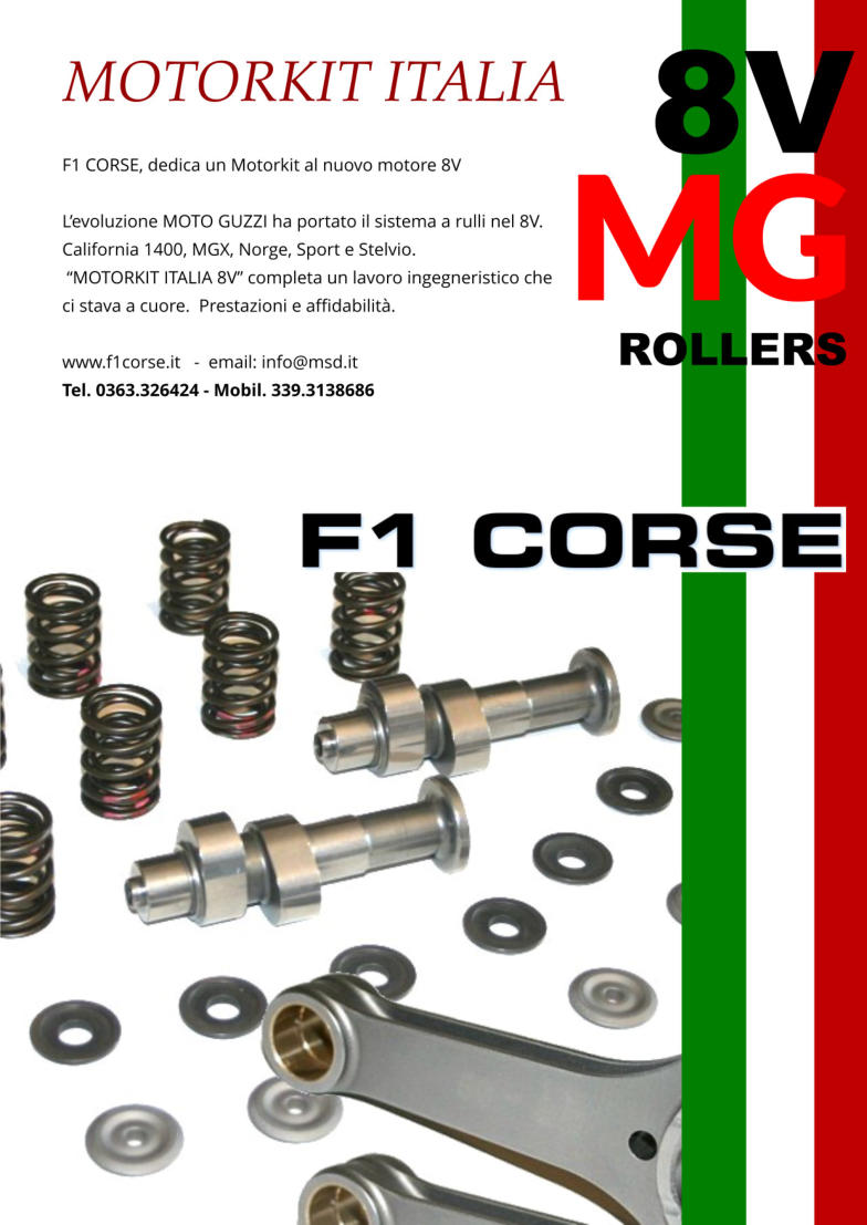 Rotazione al minimo perfetta, coppia aumentata agli intermedi e allungo marcato, questo è il motore F1 CORSE per gli 8V GUZZI!